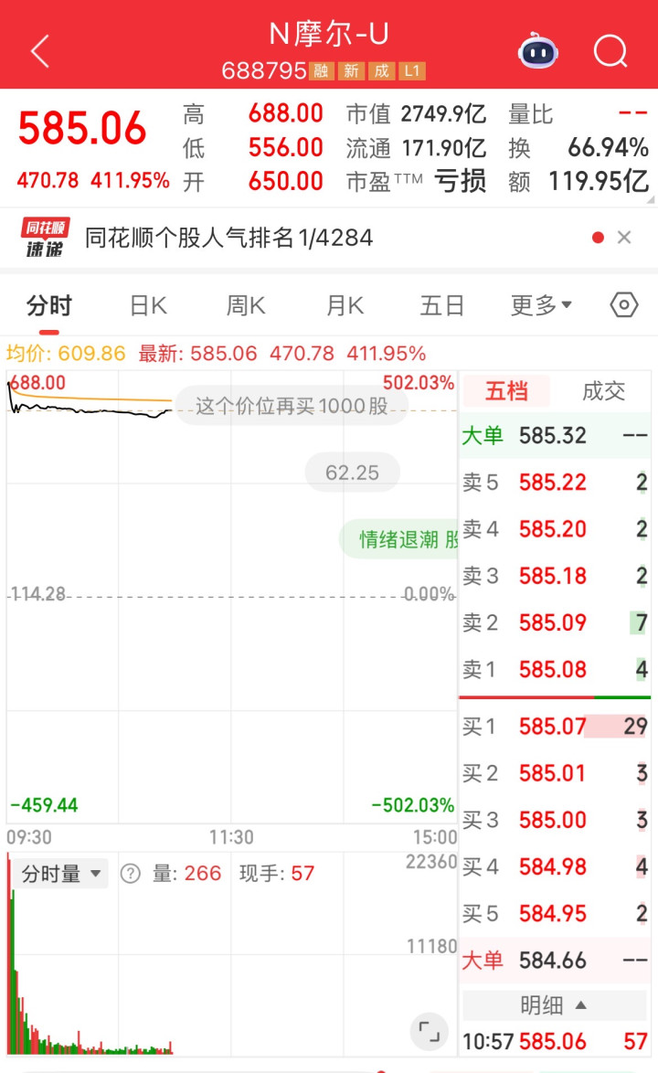 从上市首日的早盘表现来看,公司股价一度涨超500%,冲高至688元/股,截至记者发稿,摩尔线程的涨幅略有收窄,涨411.95%,报585.06元/股,但依旧保持高位态势,这也令一众中签的机构赚得“盆满钵满”。